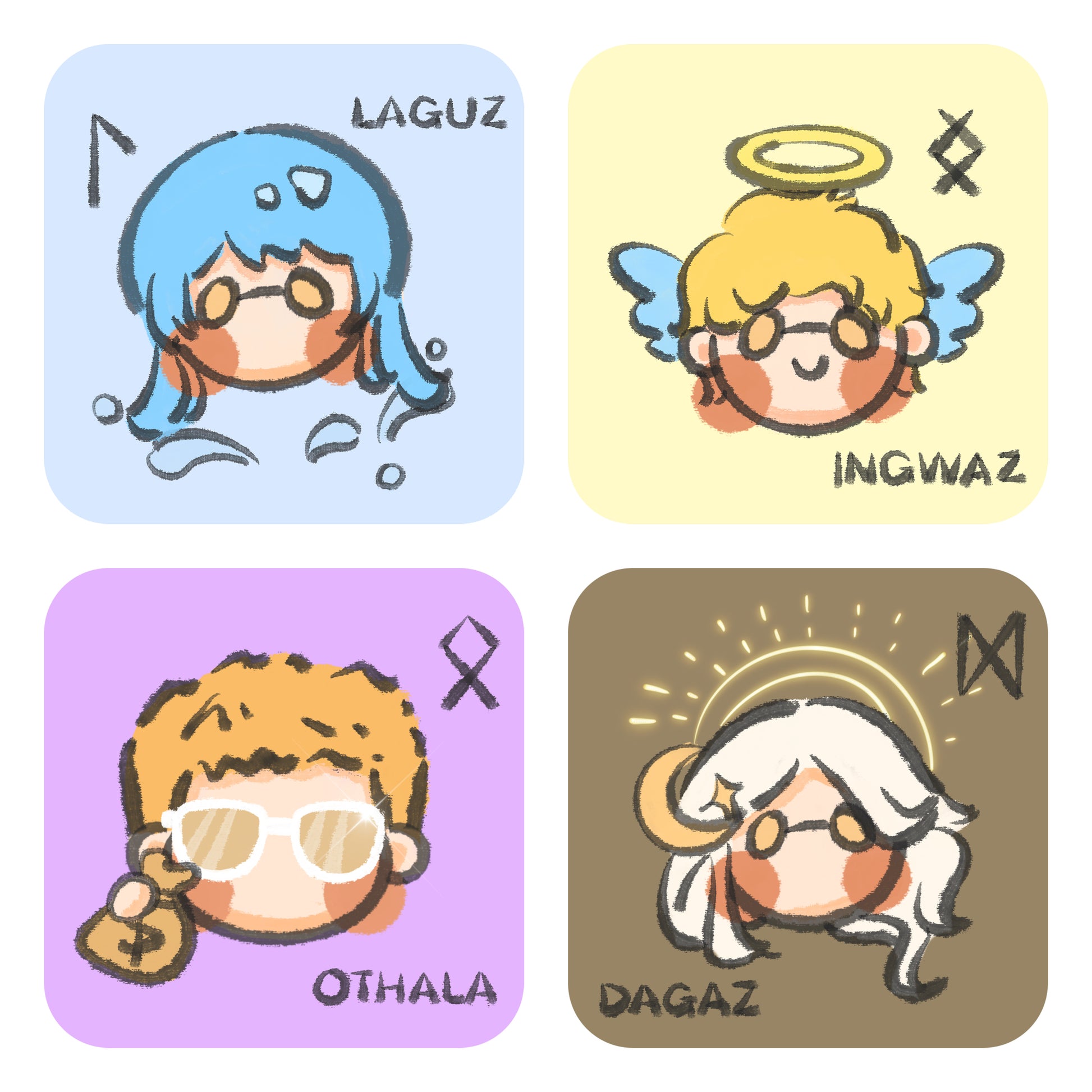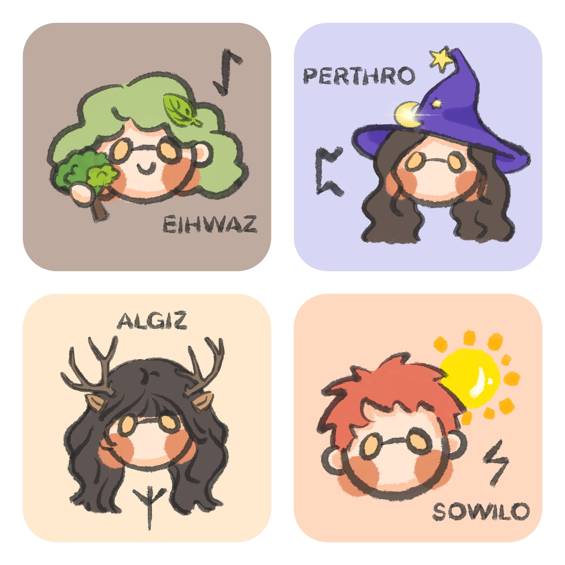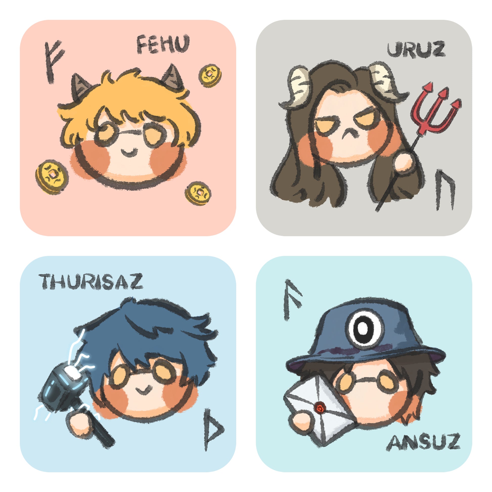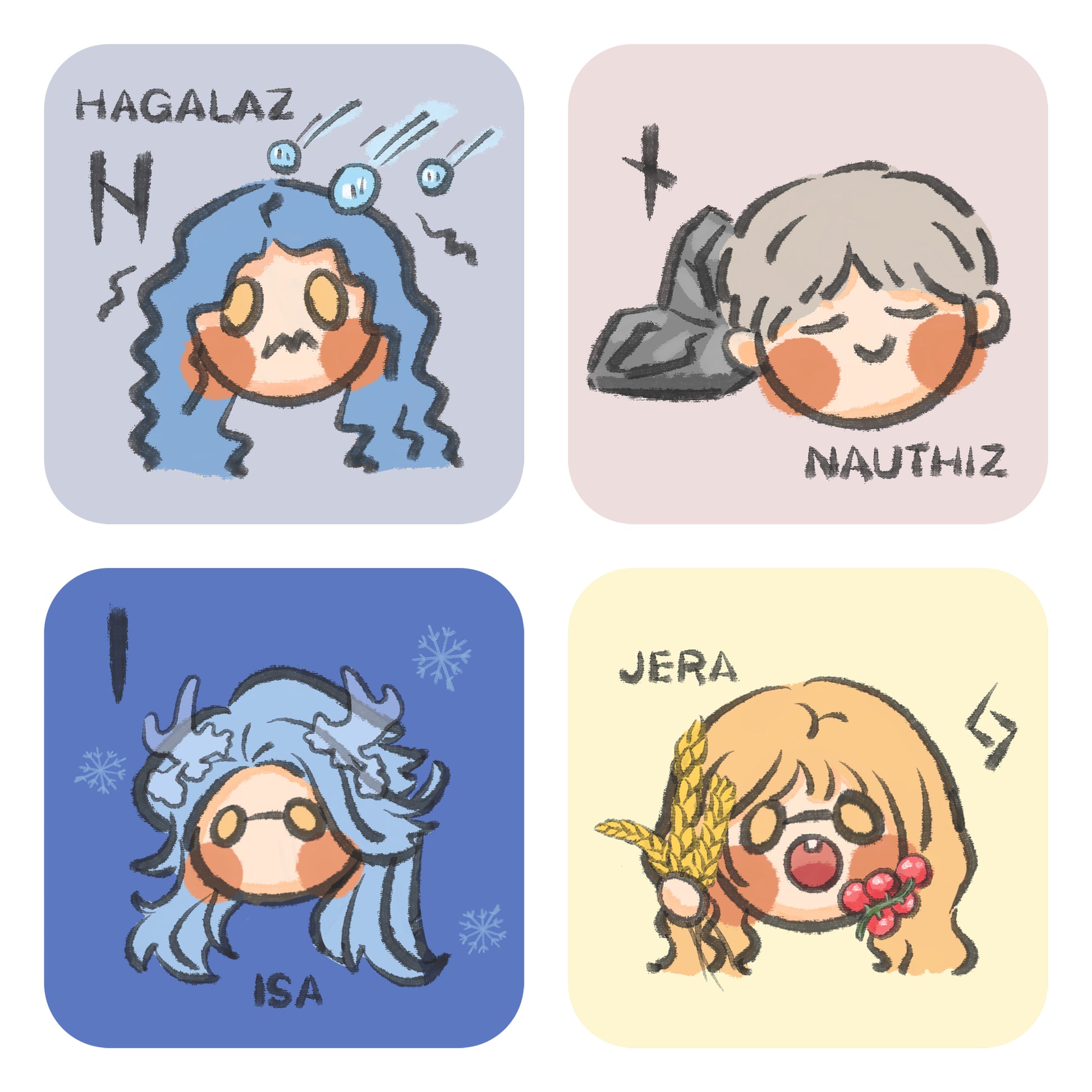 Bizarre Ink Runes presents the imagery and symbolism of each Rune in a unique and adorable way, using simple strokes and vivid characters such as bison, Thor's hammer, and travel.