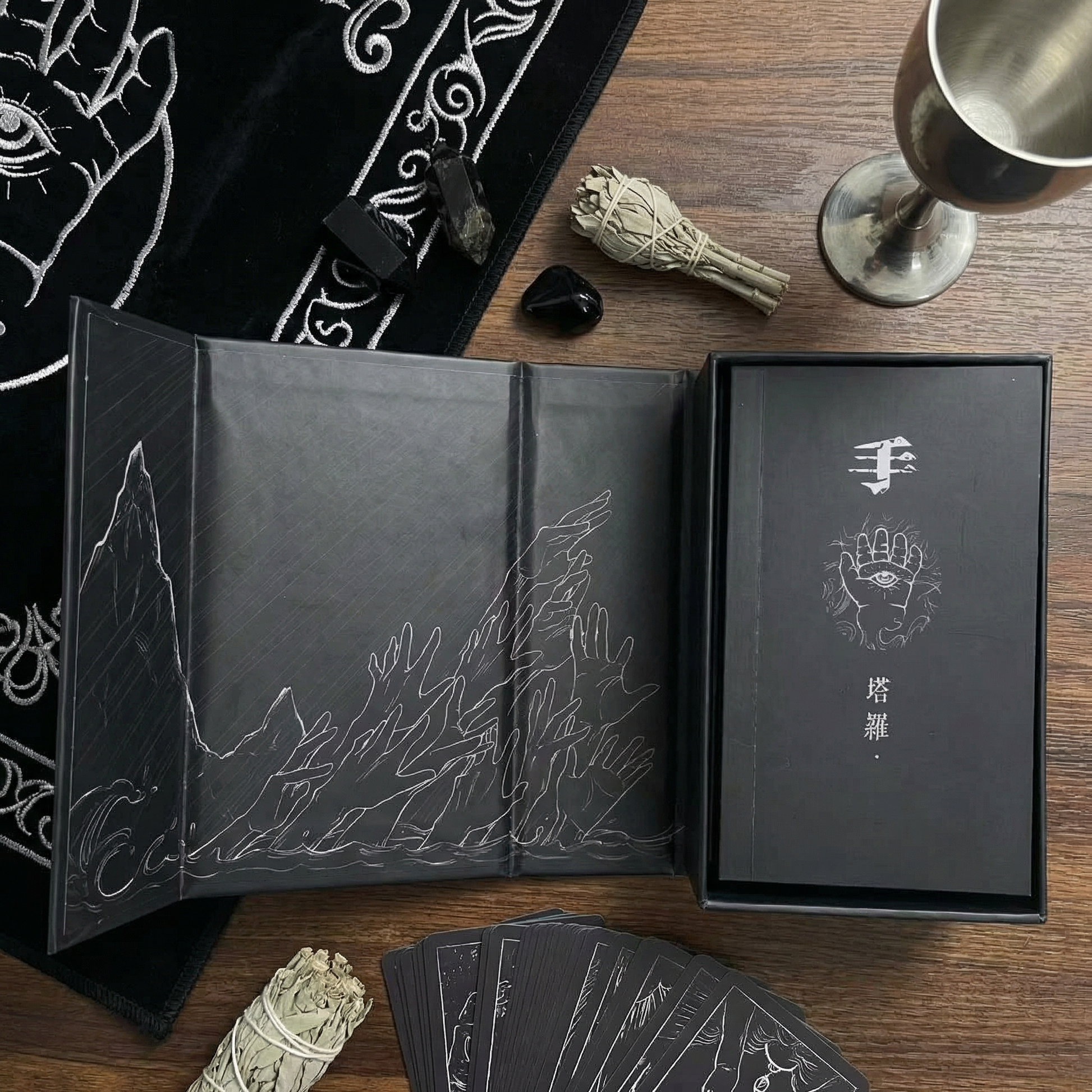 Tarot of Hand (Hand Tarot Deck) is a Tarot Deck featuring black & white line-art visuals with a mysterious “hand & eye” motif.